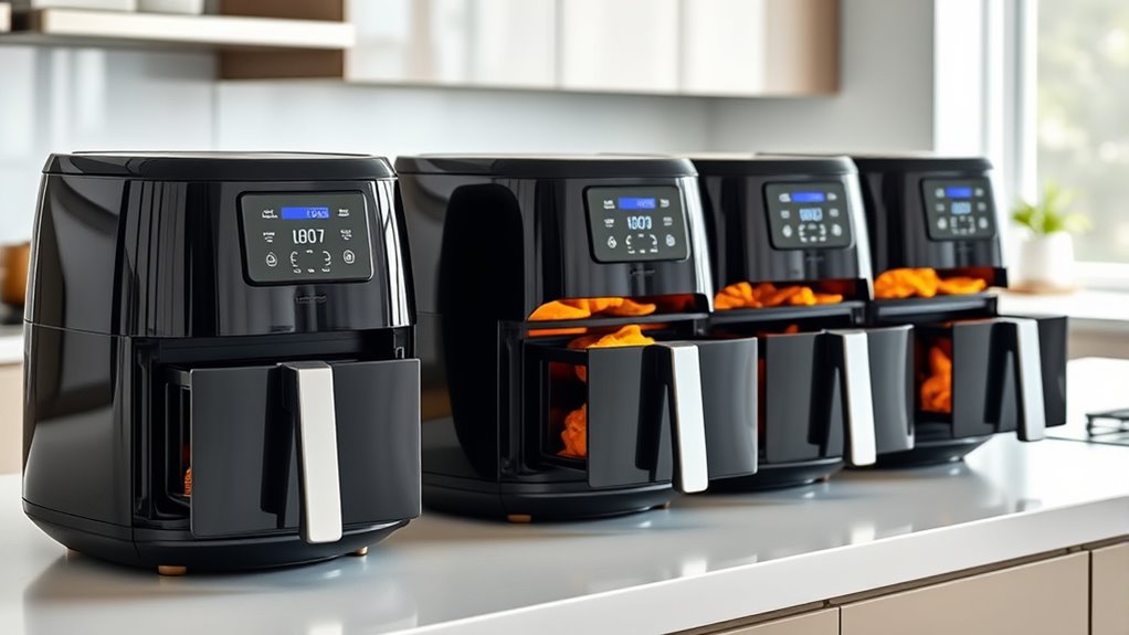 Choosing an air fryer with the right power and efficiency features can make a big difference in your cooking experience. Higher wattage, like 1700W or more, means faster preheating and quicker cooking times, saving you time. Dual fans and multiple heating elements guarantee even heat distribution, leading to uniform results and better energy use. Features such as automatic shutoff and precise temperature controls help optimize power consumption and prevent waste. Independent zone controls allow cooking different foods simultaneously, reducing overall cooking time and energy expenditure. Additionally, energy-efficient designs with insulation and advanced airflow technology minimize power use while maintaining consistent results. Focusing on these power and efficiency factors helps you select a model that’s both powerful and economical, making your cooking more convenient and cost-effective.