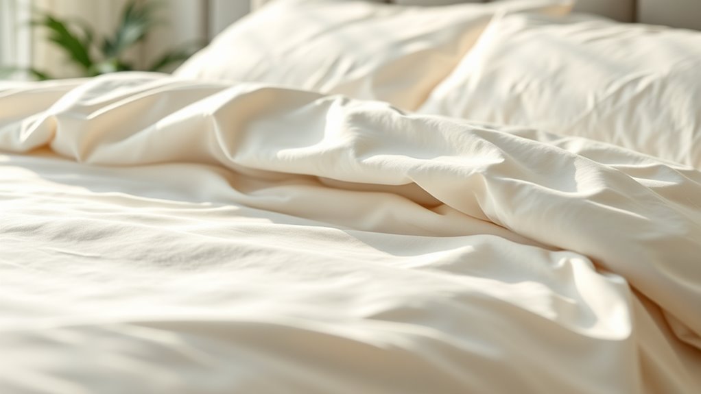 Bamboo sheets are superb for sensitive skin and allergy sufferers. They’re naturally hypoallergenic, resisting dust mites and bacteria, which helps reduce allergic reactions. Plus, their silky softness soothes sensitive skin, preventing irritation and itching. I’ve found that bamboo’s breathable breathability keeps me cool and comfortable all night, making them a smart, soothing choice for anyone with allergies or delicate skin seeking a restful, rash-free sleep.