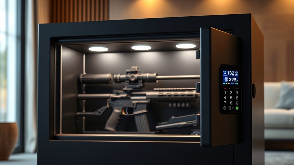 Looking for the best biometric gun safes in 2025? I recommend safes with rapid fingerprint recognition, multiple access options, and durable builds for maximum safety. These safes feature quick release times, tamper-proof designs, and are suitable for pistols, rifles, or multiple firearms. They’re easy to install and often include extra features like voice prompts and LED lighting. Keep exploring to discover which models stand out for your home security needs.