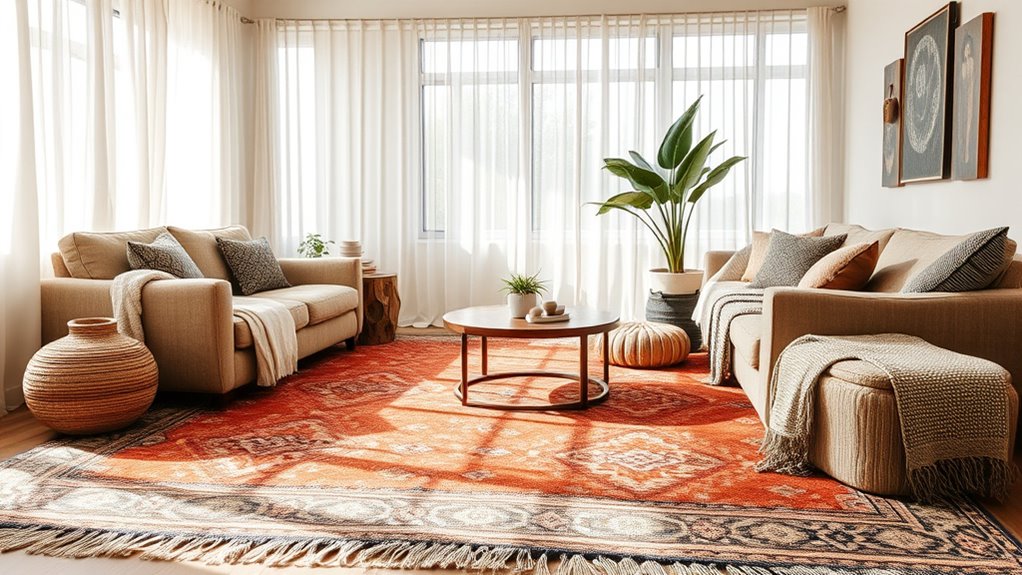 Choosing the right boho area rug involves more than just picking a pretty pattern; it requires careful consideration of several key factors. First, think about the size of the rug to verify it fits your space and complements your furniture layout. For example, a 5×7 rug works well in smaller rooms, while an 8×10 is great for larger areas. Next, evaluate the material and pile height to strike a balance between comfort, durability, and maintenance. Low pile faux wool or polyester options are easy to clean and perfect for busy households. Safety is also essential—look for rugs with non-slip backing like TPR or rubber to prevent slips, especially around children and pets. Finally, choose designs and colors that match your boho aesthetic, and consider cleaning instructions to keep your rug looking fresh.