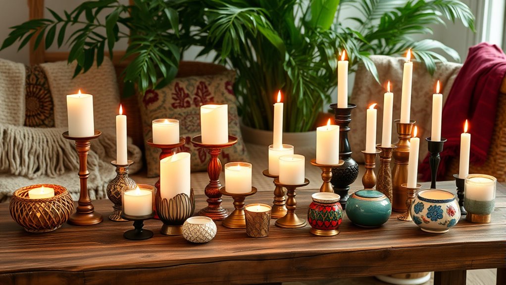 If you’re looking to add chic boho charm to any space, I recommend exploring a mix of natural materials like wood, rattan, and coconut shells, along with vintage-inspired glass and handcrafted details. From rustic wooden candle holders to woven lanterns, each piece can bring warmth and personality to your decor. If you want to discover my top favorites and tips on choosing the perfect ones, keep going—there’s plenty to inspire your style.