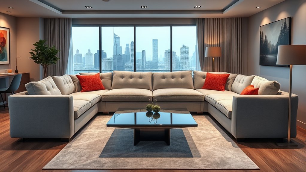 Evaluating your living space is essential before choosing a convertible U-shaped sofa. First, measure your room’s dimensions—length, width, and height—to ensure the sofa fits comfortably without overcrowding. Consider the layout to see if a U-shape complements your space, offering enough seating while maintaining easy flow. Think about doorways, hallways, and potential obstructions that could impact delivery or assembly. Also, assess if your space allows for different configurations like L-shape or sofa bed, based on your needs. Don’t forget to leave enough clearance around the sofa for movement and cleaning, especially if it has added features such as storage or reclining elements. Proper planning guarantees your chosen sofa enhances your space without sacrificing functionality or comfort.