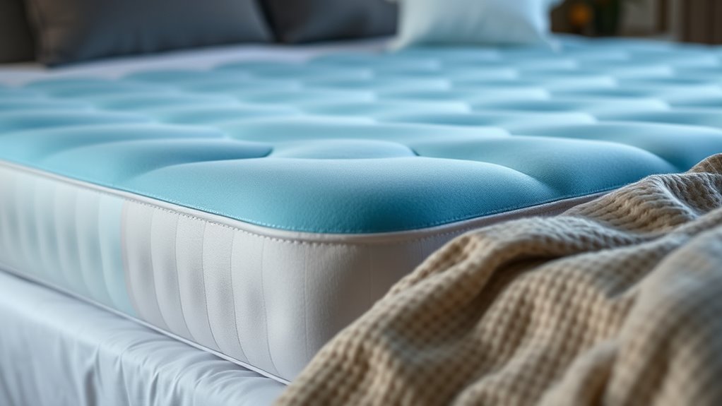 Have you ever wondered how mattress toppers keep you cool throughout the night? The secret lies in the cooling technology used. Many toppers feature gel infusion, which absorbs and disperses heat, helping you stay comfortable. Open-cell foam improves airflow and breathability, preventing heat from building up. Phase-change materials are another option; they absorb, store, and release heat slowly, maintaining a steady temperature. Some toppers even use vortex or vortex-infused technology to boost airflow and heat dissipation across the surface. Each technology has its unique way of managing heat, so understanding these differences can help you find the best topper for your needs. Whether you prefer enhanced breathability or temperature regulation, these options guarantee a cooler, more restful sleep.