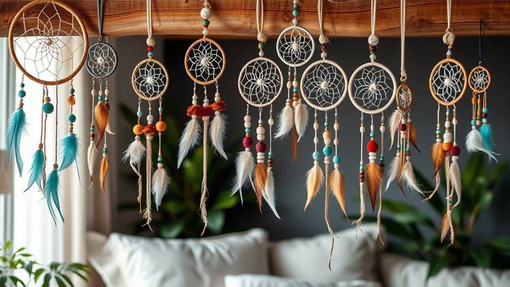 Choosing the right size and proportion for your dreamcatcher is essential to creating a balanced and harmonious bedroom decor. You want a piece that complements your wall space without overwhelming or seeming too small. Larger dreamcatchers, over 10 inches in diameter, act as striking statement pieces, while smaller ones provide subtle accents. Consider the overall length and width to ensure it fits well within your hanging area, maintaining visual harmony. It’s also important to match the size of your dreamcatcher with other decor elements like furniture or artwork, so everything looks cohesive. Keep in mind that an overly large dreamcatcher can dominate the space, whereas a tiny one might lack impact. Finding the right proportion enhances both the aesthetic and the calming function of your bedroom.