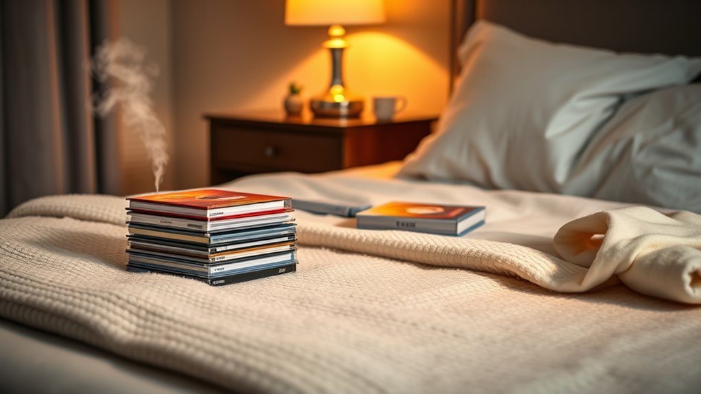Different guided sleep meditation CDs utilize a variety of relaxation techniques to help you unwind and shift into sleep. I’ve found that methods like deep breathing, progressive muscle relaxation, visualization, and body scanning are commonly used to promote calmness and reduce tension. Some recordings incorporate binaural beats or brainwave entrainment to align your brainwaves with sleep-friendly frequencies, enhancing relaxation. Many also feature calming background sounds such as nature noises or soft music, which can deepen the sense of tranquility. When choosing a CD, consider which techniques resonate most with you, as preferences vary—some may respond better to gentle guidance, while others prefer immersive visualization. The right combination of these techniques can considerably improve your ability to relax, de-stress, and move seamlessly into restful sleep.
