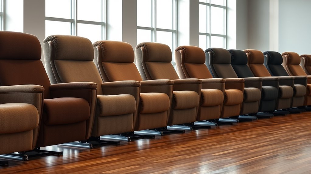 Choosing a heavy-duty lift chair requires paying close attention to its weight capacity, which typically ranges from 350 to 500 pounds. This limit indicates the maximum user weight the chair can safely support. Going beyond this range can weaken the chair’s structural integrity, safety features, and durability. Chairs with higher weight capacities usually have reinforced frames, stronger motors, and thicker upholstery to guarantee stability and safety. It’s essential to verify the manufacturer’s listed weight capacity to avoid potential mechanical failure or safety hazards. For added safety and longevity, I recommend selecting a chair that supports at least 10-20 pounds more than your weight. This extra margin provides peace of mind and ensures the chair remains reliable over time.