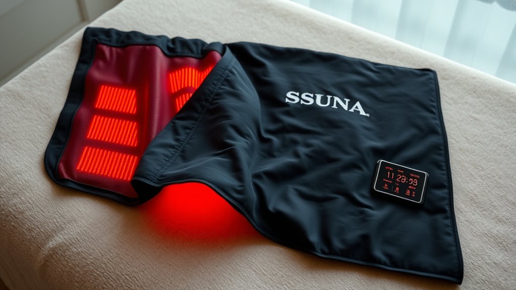 An infrared sauna blanket that’s easy to operate can make your wellness routine much more enjoyable. Look for models with intuitive controls like simple dials or remote options, so adjusting temperature and time is straightforward. Clear instructions and safety features such as automatic shut-off or overheat protection boost confidence and guarantee safe use. A quick setup process, minimal assembly, and fast warm-up times help you get started without hassle. Lightweight and foldable designs enhance portability and make storage effortless, especially if space is limited. Features like preset programs or customizable settings allow you to tailor each session to your needs without fuss. Overall, an easy-to-use sauna blanket saves time, reduces frustration, and lets you focus on relaxation and wellness.