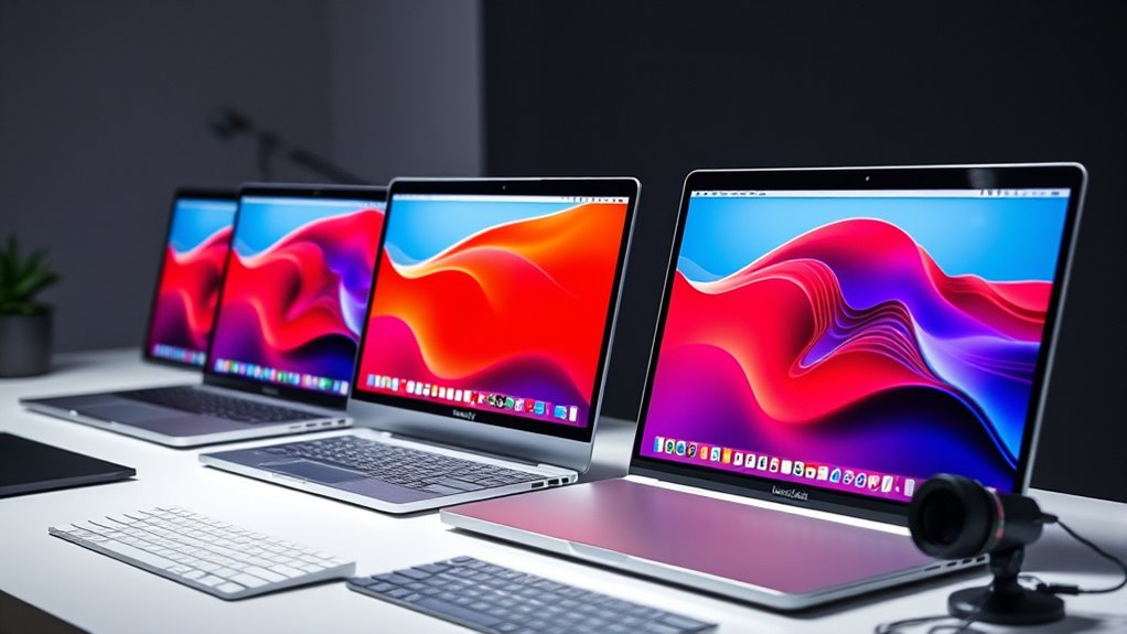 If you’re a power user, I recommend choosing the latest MacBook Pro models with 64GB or more of unified memory. The M4 Max-powered versions offer exceptional performance for demanding workflows like 3D rendering, massive data processing, and creative work. They come with high-resolution Liquid Retina XDR displays, extensive external support, and long battery life. To find the top 10 options tailored for intensive tasks, continue exploring as I break down the best choices for your needs.