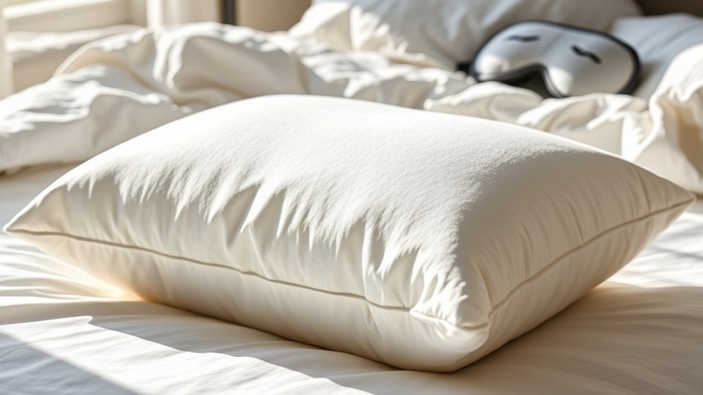 Since proper neck and shoulder alignment is essential for comfortable side sleeping, an adjustable loft feature becomes a vital factor to contemplate. This allows me to modify the pillow’s height and firmness, ensuring my head stays aligned with my spine. With customizable support, I can prevent neck strain and shoulder discomfort by tailoring the pillow to my sleep preferences. Features like removable layers or fillings let me adjust the thickness easily, promoting better spinal alignment. Adjustable loft pillows also adapt to changing sleep positions or preferences over time, maintaining consistent comfort. Personalizing the loft reduces pressure points and minimizes restless movements, leading to a more restful night. Overall, this flexibility helps me achieve ideal support and comfort tailored specifically to my needs.