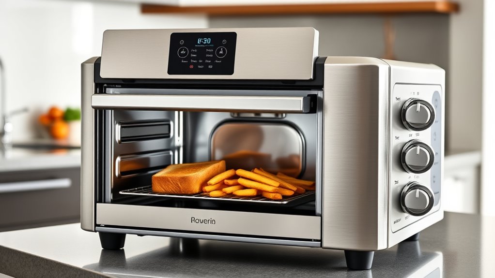 The design and aesthetics of a multifunction toaster oven with an air fryer considerably impact how well it complements your kitchen style and space. I look for appliances with sleek finishes like stainless steel or modern black, which blend seamlessly with various decor themes. Features such as French doors, large viewing windows, and digital displays not only boost visual appeal but also improve usability. Space-saving designs like flip-up or roll-top doors are perfect for small kitchens, helping to maximize counter space. The materials and finishes matter too—they influence durability, ease of cleaning, and overall style compatibility. An attractive appliance doesn’t just look good; it elevates your kitchen’s aesthetic while offering functional benefits that make cooking more enjoyable.