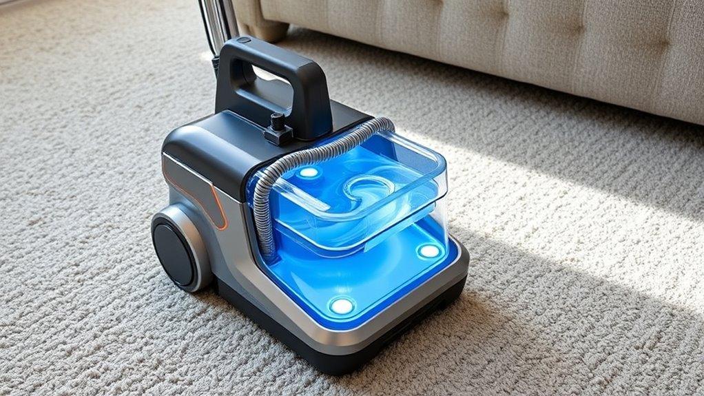 Strong suction power is essential for effectively removing dirt, stains, and debris from carpets and upholstery. It’s usually measured in Kpa or Pa, and higher levels mean better cleaning performance. A more powerful motor and thoughtful design boost suction, helping to lift embedded dirt more thoroughly. Consistent suction without losing strength during use guarantees that dirt and moisture are extracted efficiently, reducing the need for multiple passes. Faster drying times often come with stronger suction, making the cleaning process quicker. Features like dual water tanks and adjustable settings help tailor the power to different stains and surfaces, enhancing overall effectiveness. When choosing a portable cleaner, prioritize models with robust, reliable suction that can handle various messes without losing strength mid-clean.