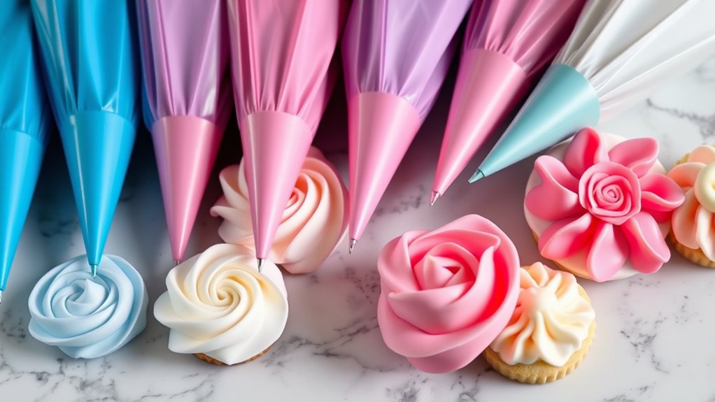 A well-designed grip on a pastry bag can make all the difference in achieving precise, clean decorations. A comfortable handle or textured surface helps improve grip, reducing hand fatigue during extended decorating sessions. Ergonomic designs with non-slip materials guarantee you maintain control, especially when applying pressure for detailed work or heavy icing. The balance between flexibility and stiffness in the bag affects handling; the right mix allows for accurate control without making squeezing difficult. Proper grip features also facilitate precise tip placement, resulting in cleaner, more consistent designs. Additionally, a good grip minimizes slipping or twisting, making decorating safer and more efficient. Overall, choosing a pastry bag with a thoughtful design and handling grip is essential for professional-quality results.