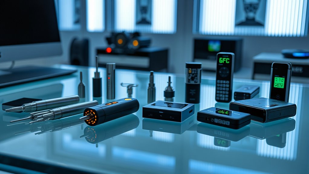 In my experience, choosing the right RFID cloning tool depends on your specific needs. For example, I once helped a security team quickly duplicate access cards during a system upgrade, saving hours of manual work. Whether you’re a security enthusiast or need reliable duplication for access management, understanding these top devices guarantees you pick the best for your situation. Always prioritize security and legality—use these tools responsibly and ethically.