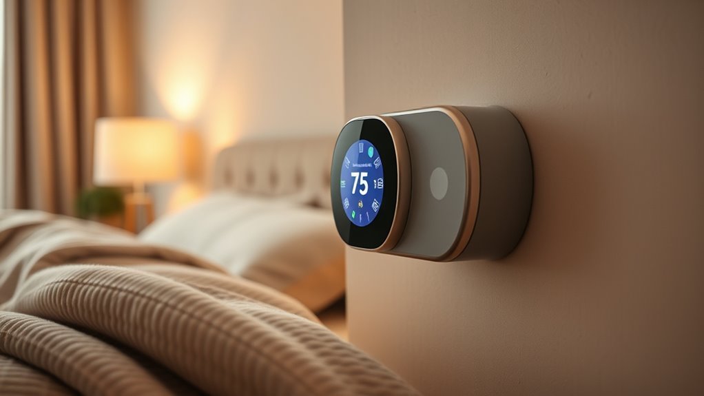 Smart thermostats improve my sleep by automatically adjusting the temperature to ideal levels, ensuring I stay cozy without overheating or feeling cold. They learn my preferences over time, so the room stays comfortable throughout the night. Plus, I can set schedules or control it remotely, which helps me wind down and wake up refreshed. It’s like having a personalized sleep environment that promotes better rest and energy during the day.