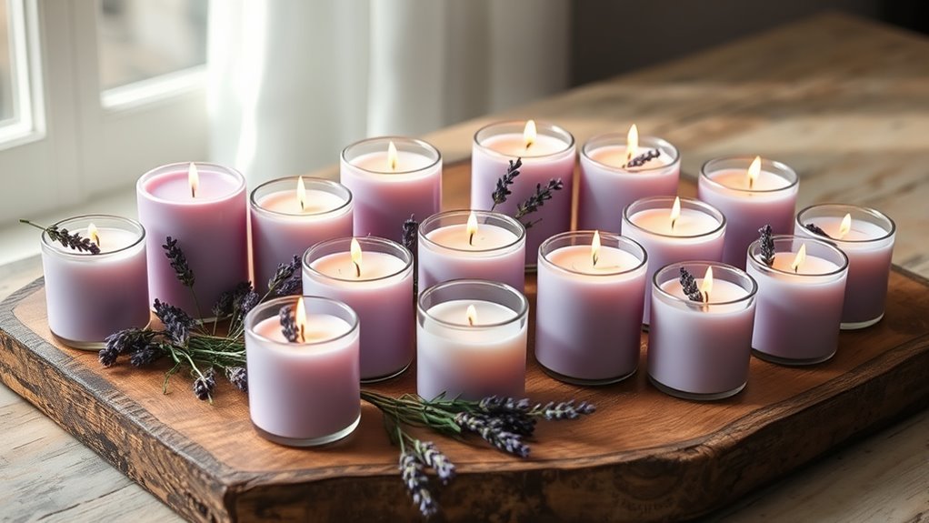 Yes, soy lavender candles can be safe for children and pets if I choose high-quality, natural ingredients and avoid those with synthetic fragrances or harmful chemicals. I always keep candles out of reach and never leave them unattended. It’s important to guarantee proper ventilation and use candles in well-ventilated areas. When in doubt, I prefer flameless options, especially around curious little ones and furry friends.