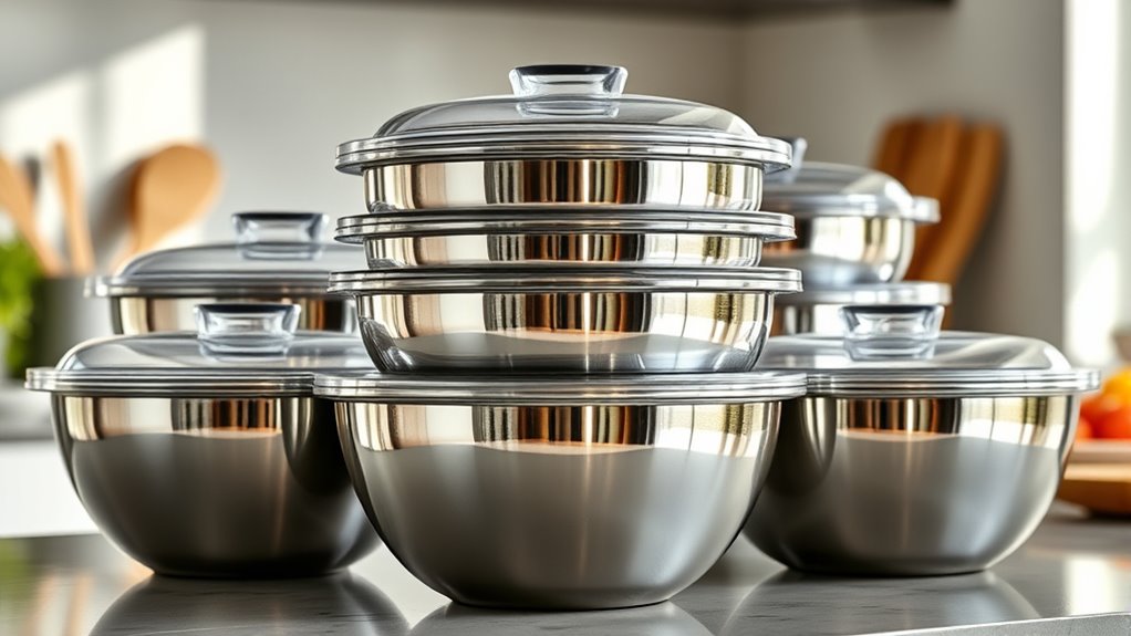 I’ve looked at the top stainless-steel mixing bowls with lids that make kitchen prep easier. These sets are durable, rust-resistant, and often come with airtight lids that keep food fresh. They range from small 1.5-quart bowls to large 8-quart options, perfect for any task. Many feature nesting designs for space-saving storage and include non-slip bases for stability. Keep scrolling to explore detailed options and find the perfect fit for your kitchen needs.