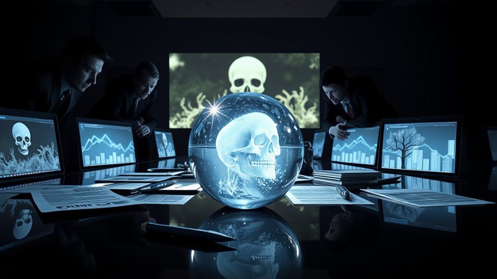 Sometimes, sensing death in dreams is a projection of your fears or anxieties rather than an actual prophecy. You might dream of dying during a stressful period, and the dream’s purpose isn’t to predict death but to process feelings of loss, vulnerability, or uncertainty. Your subconscious awareness filters these emotions into symbols of death, letting you confront what you’re avoiding in waking life. In this way, dreams serve as a mirror reflecting your inner landscape, offering a chance to address unresolved issues. The vividness of these dreams can make you wonder if they hold prophetic power, but more often, they are personal symbols crafted by your subconscious to help you navigate emotional terrain. Additionally, understanding projected symbols in dreams can deepen your insight into your psychological state.