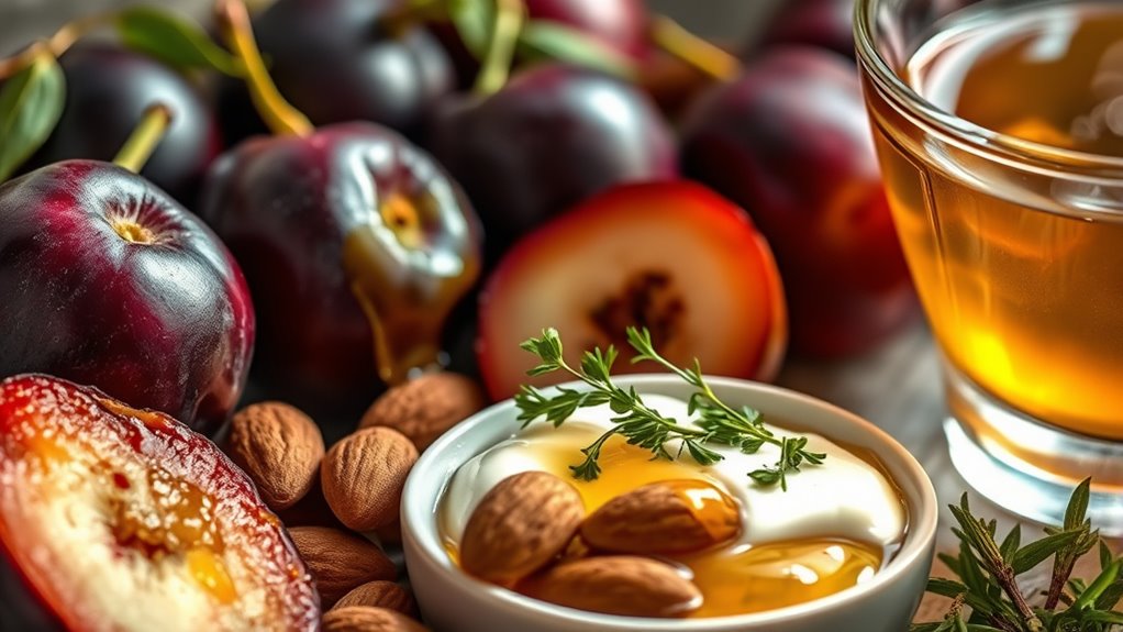 To enhance your vivid lucid dreams, focus on eating foods rich in tryptophan like turkey, dairy, nuts, and complex carbs such as sweet potatoes to boost serotonin and melatonin. Incorporate choline-rich foods like eggs and fish to improve dream recall, and enjoy sleep-friendly herbal teas or tart cherries to support restful sleep. Maintain good sleep hygiene and create a calming environment to maximize REM cycles. Keep exploring for more tips to uncover deeper dream experiences.