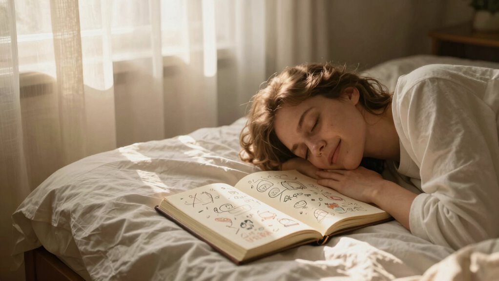 Ironically, certain foods actually influence your dreams more than you’d think. Food influence acts as dream triggers, subtly shaping your subconscious during sleep. Spicy or heavy meals right before bed can lead to vivid, bizarre dreams, while dairy might bring on more peaceful, comforting visions. So, next time you want dream content to shift, consider what you’re eating—your dinner might be the hidden puppeteer of your nightly adventures.